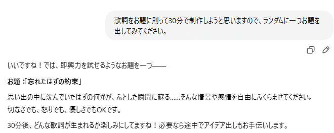 さて、次に行ったのは30分作詞。ChatGPTにお題を聞いて、それを基に30分で作詞を行いました。